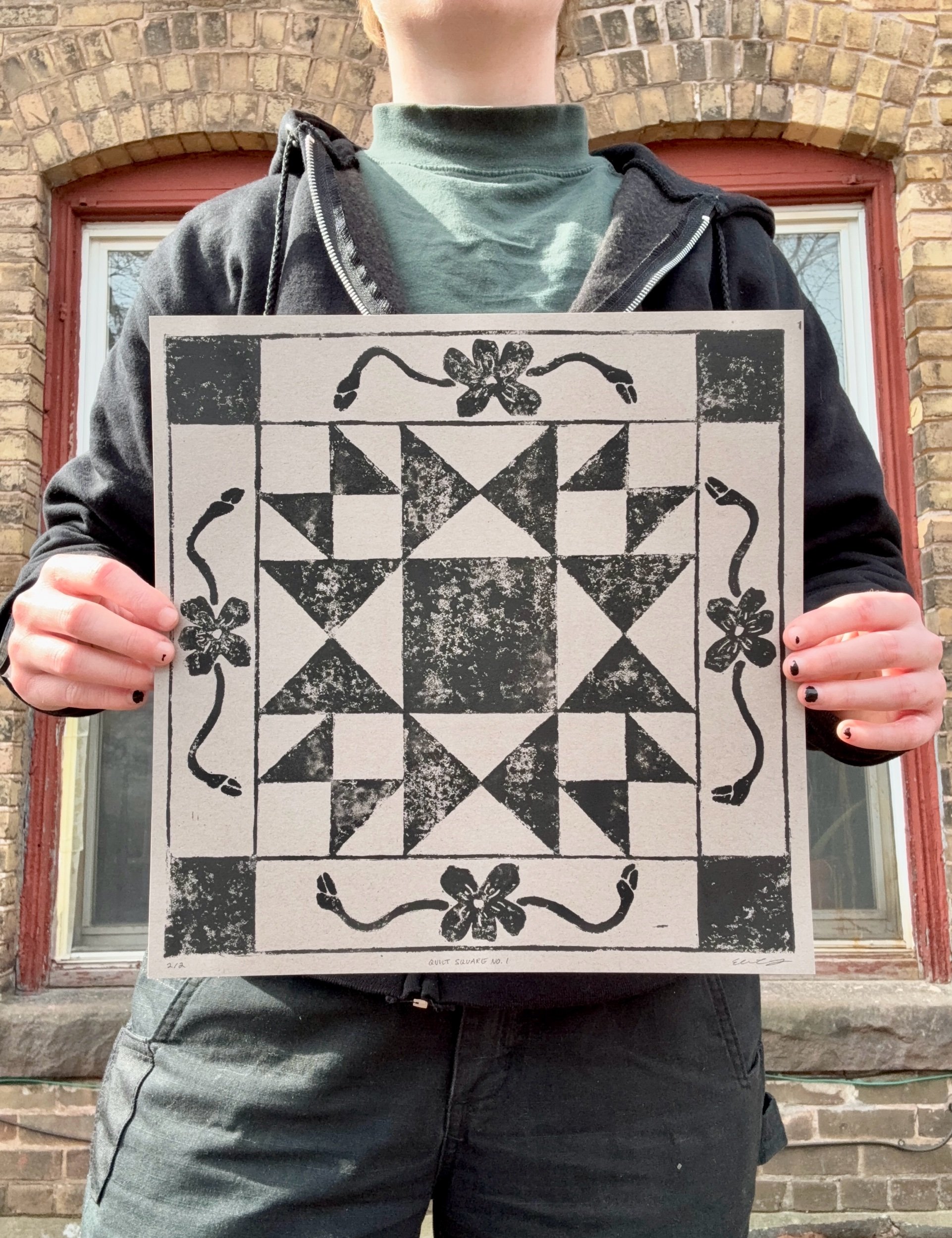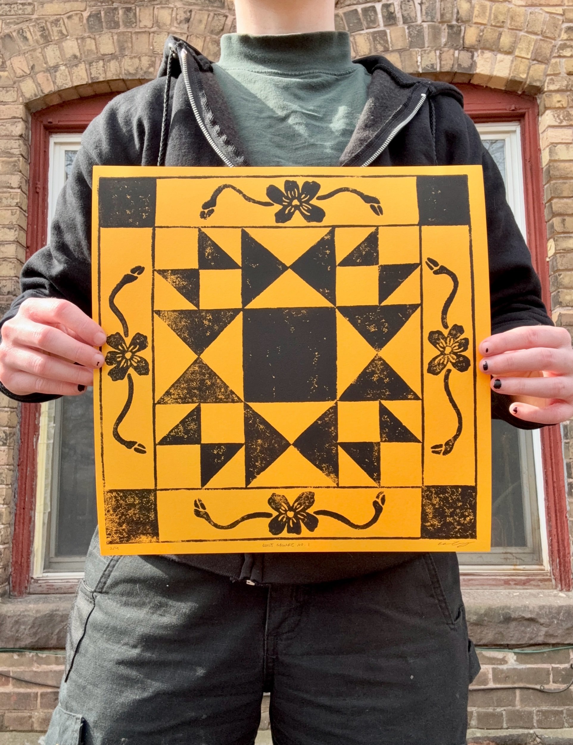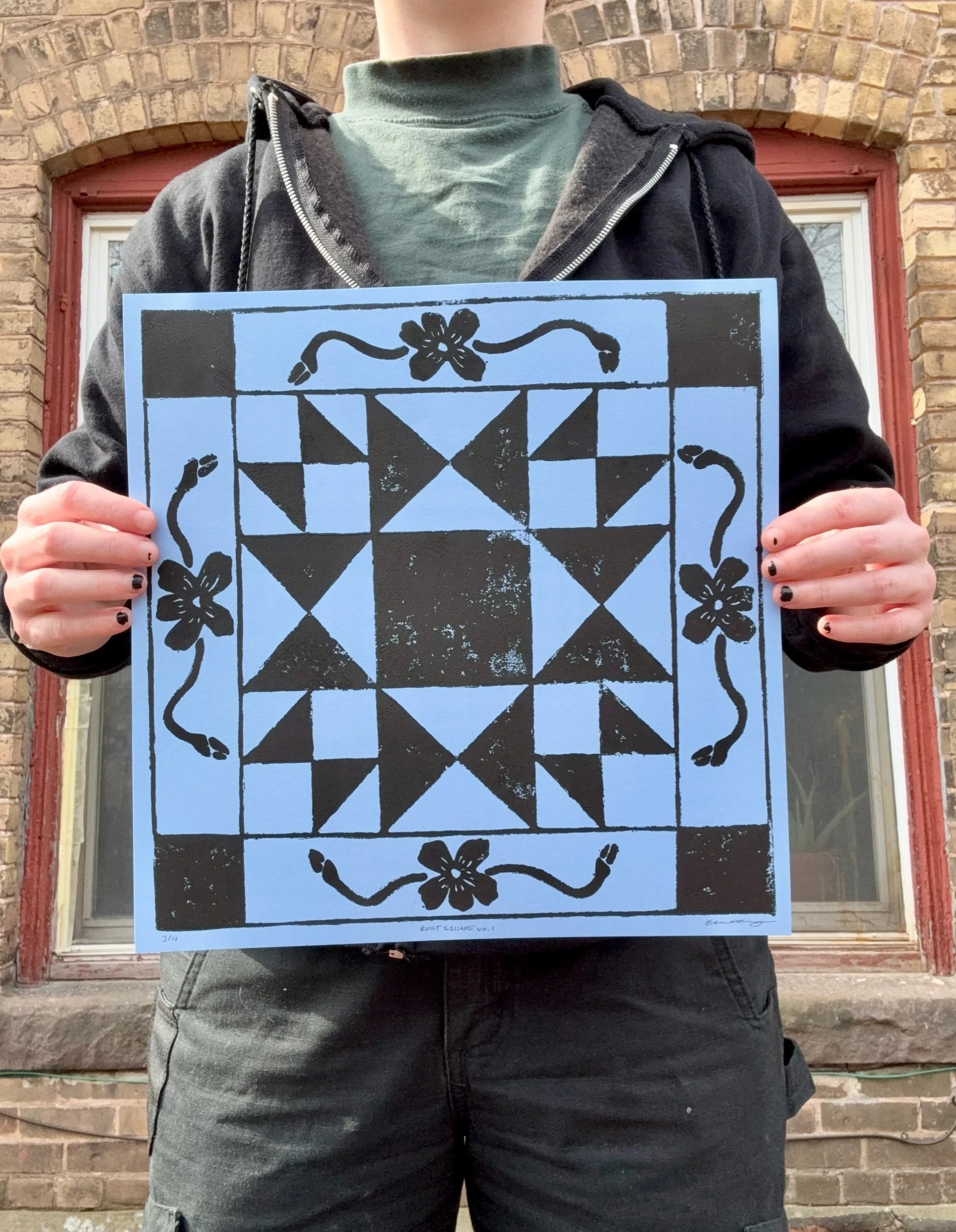 Shop › Quilt Square No. 1 print Image 1 of 3 Image 2 of 3 Image 3 of 3 Quilt Square No. 1 print $25.00 Hand block printed Original design12” x 12” Color: Yellow Blue Taupe Add To Cart Added! Hand block printed Original design12” x 12”
