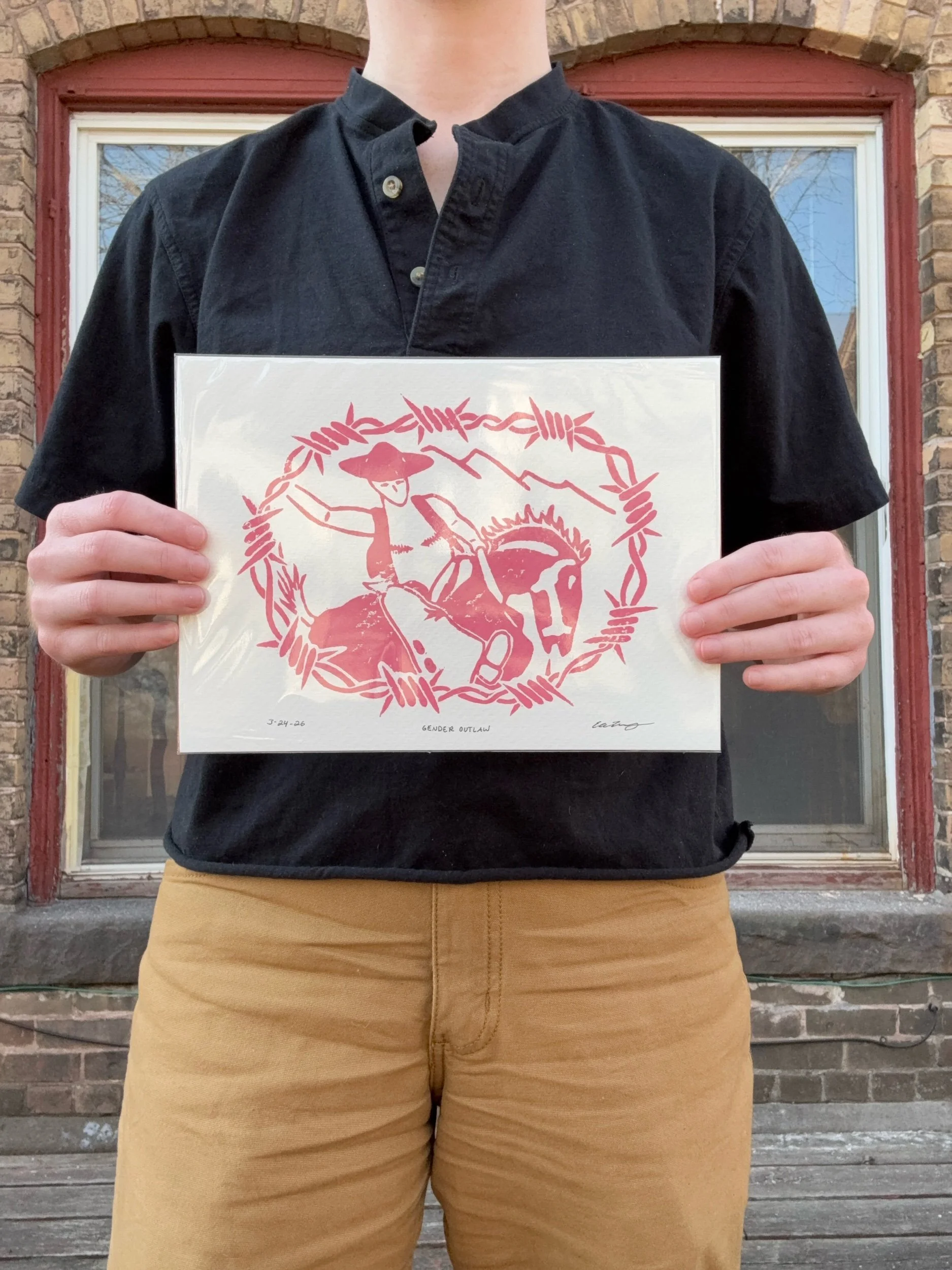 Shop › Gender Outlaw print Image 1 of 1 Gender Outlaw print $15.00 Hand block printedOriginal design7” x 10” Add To Cart Added! Hand block printedOriginal design7” x 10”